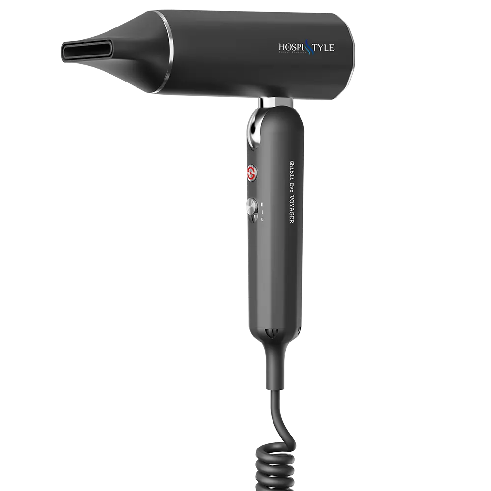 VOYAGER is a compact folding-handle hotel hair dryer that saves space without sacrificing performance. Its high-speed brushless motor (110,000 RPM) and ionic function deliver fast drying with smoother, shinier results, while the handle folds in both directions for easy storage in drawers or on wall brackets. The robust ABS housing of foldable hotel hair dryer, chromed steel joint and stainless-steel air filter ensure durability in daily hotel use.