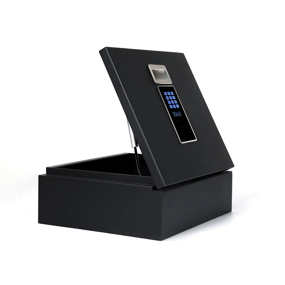 Hotel drawer safe for guest rooms and suites. Top-opening design with illuminated keypad and clear display, master/manager codes, and event log. Fits a 15″ laptop; hydraulic arm and 18 mm locking bolts for added security. CE/EMC/RoHS compliant.